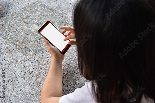The back view close up of a woman hand using a smartphone with blank screen lying on the marble table.