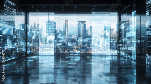 The backdrop should be clean and minimal, with large transparent windows showing a futuristic cityscape or open space.