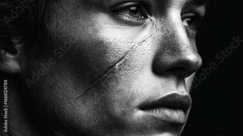 The black and white portrait features a face with a prominent scar, capturing intense emotion.