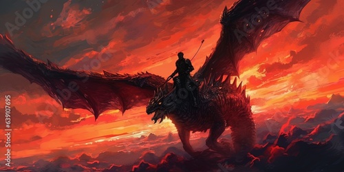 The black knight riding the dragon flying in the sunset sky, digital art style, illustration painting