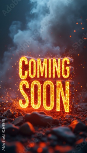 The bold Coming Soon text glows with fiery brilliance, surrounded by a dramatic smoky backdrop. This striking visual creates an atmosphere of anticipation and excitement, perfect for upcoming events