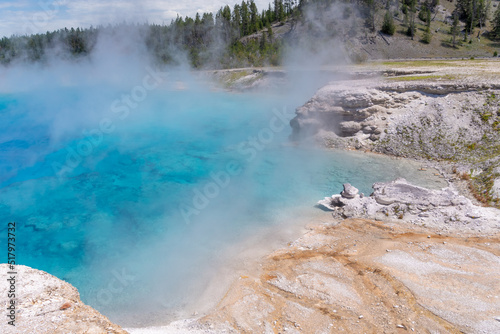 The bright blue pool of Excelsior Geyser at the Midway Geyser Basin in Yellowstone National Park.