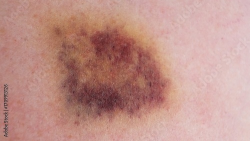 The bruise on skin close-up view. Various shades of healing process. Dark purple and yellow bruising colors on white skin. The violence concept. The consequences of injury. High quality 4k footage