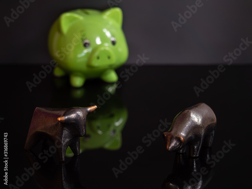 The bull and the bear on a black glas bottom with blurred piggy bank behind. Concept of the investments against savings.