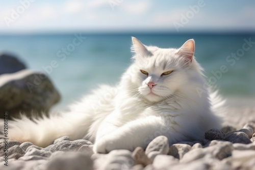 The cat is sunbathing on the beach. The long-awaited vacation. Cat resting on a sandy beach.