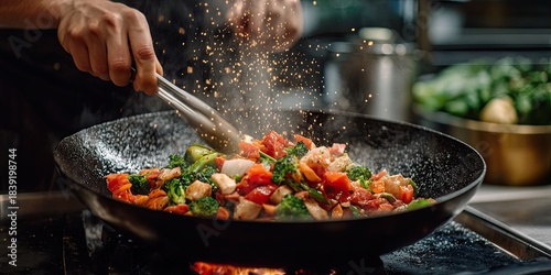 The chef skillfully stirs vibrant vegetables in a sizzling wok, capturing the essence of dynamic cooking.