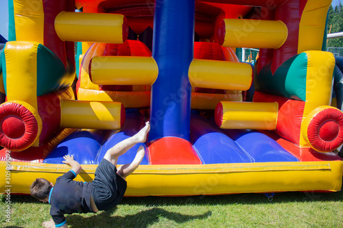 The child has fun on an inflatable structure. Game Zone.