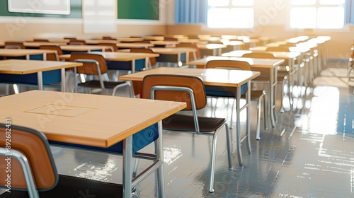 The Classroom Awaits: Empty Desks in a Sunlit Schoolroom
