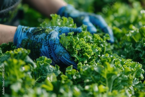 The closeup of gloved hands picking salad, lush green field, natural daylight, detailed and vibrant scene