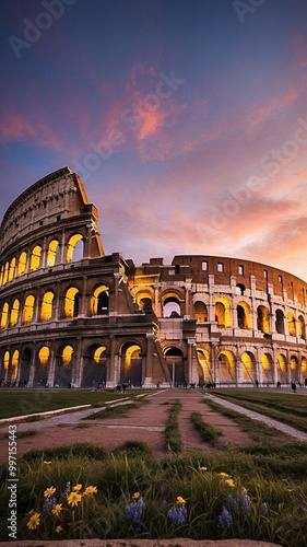 The Colosseum in Rome is illuminated with warm tones as the sun sets, creating a magical atmosphere that evokes ancient history and the beauty of the sunset.