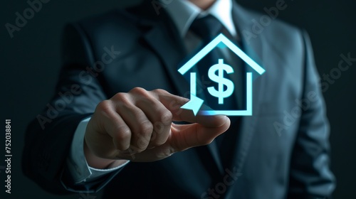 The concept of interest rates and dividends. A businessman with an up arrow and a percentage signifying the ongoing rise in interest rates