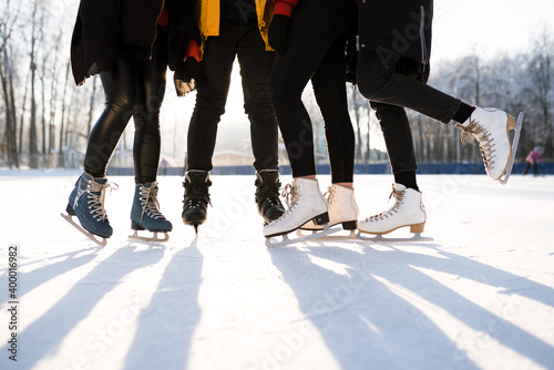The concept of outdoor activities using skates on snowy ice. Outdoor vacations
