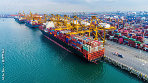 The container ship is waiting for unloading at the port. Transportation logistics concept