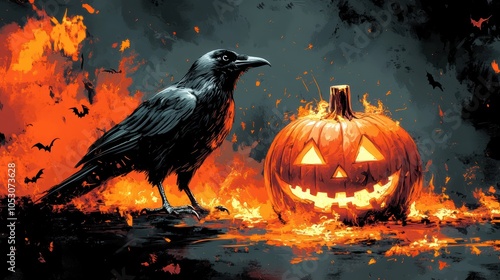 the crow standing on Halloween pumpkin, black background with distant light of drawn fire. graphic painting of witch's crow sitting on a witch's slap, a black background with light from a small fire.