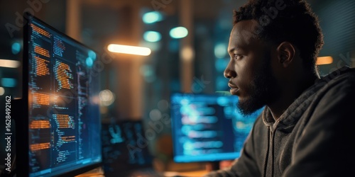 The dedicated programmer enhancing software solutions in a modern workspace at night.