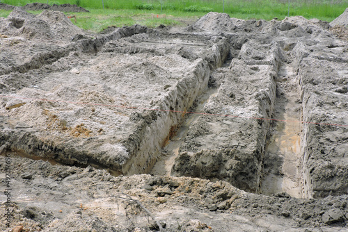 The deep excavation made for pouring concrete footing for a new house, two batter-boards and a red brick line