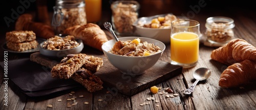 The delicious breakfast spread with cereal, fruit, and refreshing orange juice.