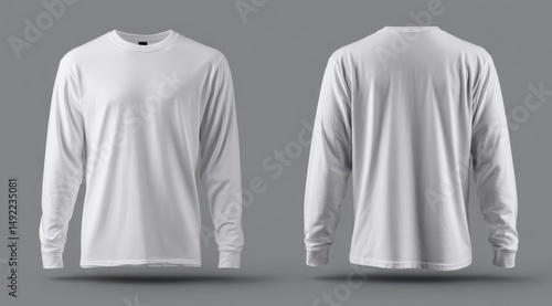 The design showcases a white long-sleeve T-shirt, presented from both the front and back views. This template is ideal for custom graphics, logos, and casual fashion designs