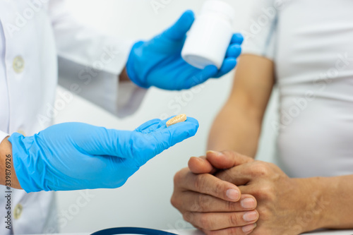 The doctor holds the drug in the hand while giving advice on how to take the drug to the patient.