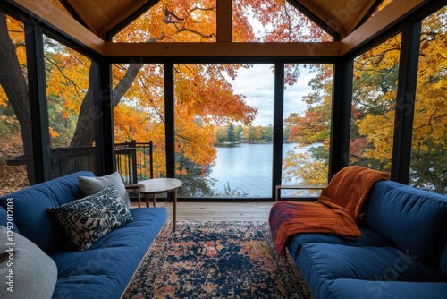 The early morning hours find a cozy screened porch, where raindrops cling to the window as autumn leaves and woods stretch out behind