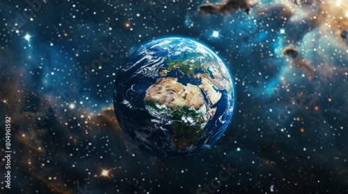 The earth in space, against a galaxy background with stars.