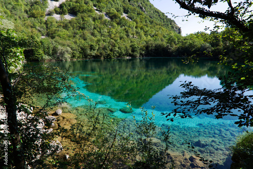 The emerald waters of Lake Cornino in the Cornino regional nature reserve, Italy