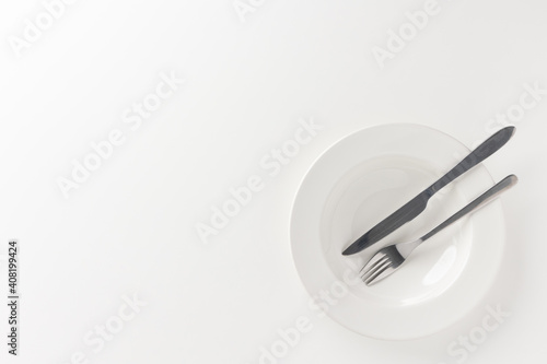 The empty white plates were set on the table with knives and forks. Ready to eat