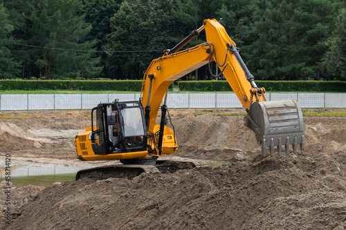 the excavator rakes sand from the pile