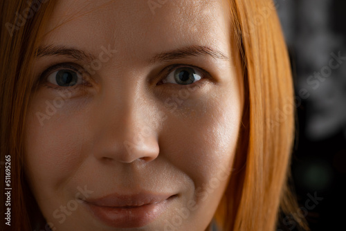 The face of a red-haired woman of middle age 40 years old close-up. She looks into the camera.