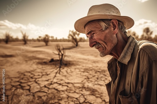 The farmer somber and despairing expression on their face. A farm under drought, barren scorched fields as far as the eye can see. A few diseased crops stick out, twisted and dying. Generative AI