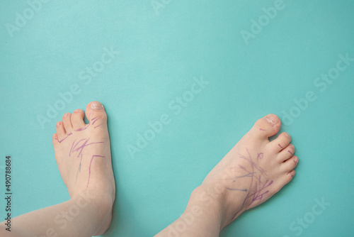 The feet of young boy streaked with felt-tip pens on a light blue background with empty copy space.
