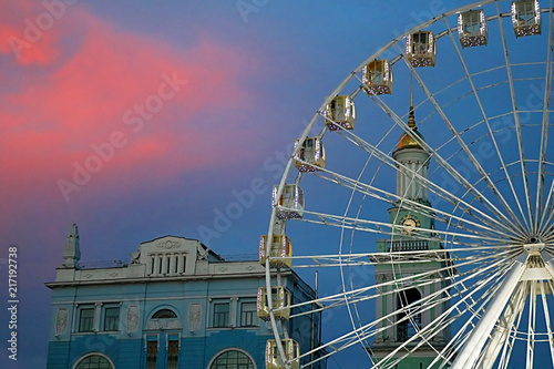The Ferris wheel in the historical part of Kyiv on the Kontraktova Square on Podol in the evening, Kyiv, Ukraine