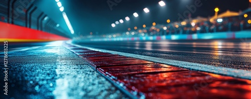 The finish line of an asphalt racetrack and a lighted race stadium at night. professional drawing of racing sports in digital 3D - Generative AI