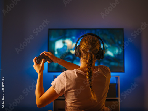 The girl plays a video game. A large monitor, a joystick in the hands of a girl, headphones on her head. Neon light. Video games, gaming business, strategy games.