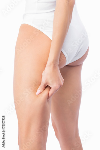 The girl stretches the skin on the leg, showing fat deposits. Treatment and getting rid of excess weight, the deposition of subcutaneous fat.