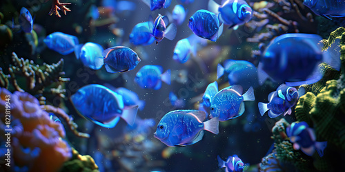 The Glowing Reef's Luminescent Symphony: A vivid array of bioluminescent fish darting past a underwater camera, amidst the intricate architecture of a thriving coral reef.