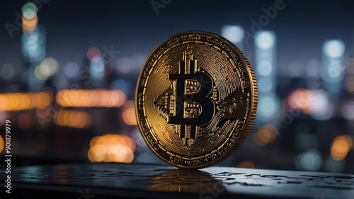 The Golden Bitcoin Coin Shining Against a City Skyline at Night
