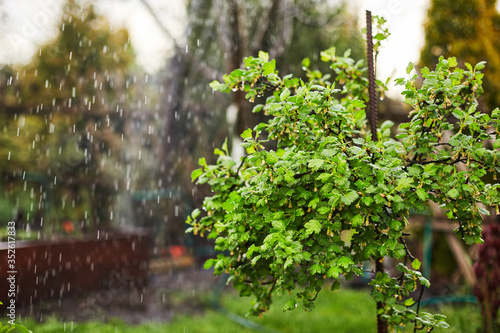 The gooseberry Bush with delicate green leaves in drops of water after watering
