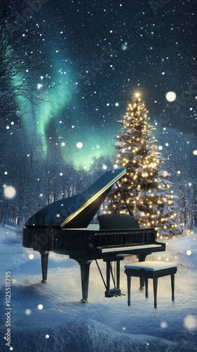 The Grand Black piano with christmas tree and snow in winter background,star and Northern Lights,player keyboard musician artist concert concept,copy space.
