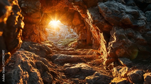 The grave of Jesus against the background of the setting sun. Ai generative.