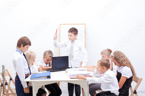 The group of teenagers sitting in a business meeting