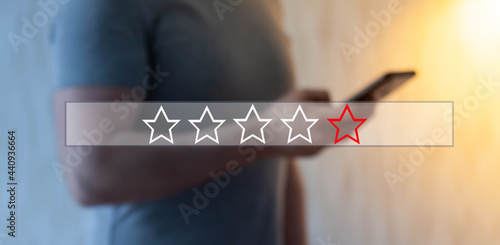 The guy rates it online, on his smartphone. Service and company assessment concept