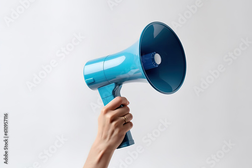 The hand holds a blue megaphone on white background. Announcement concept. Shout It Out
