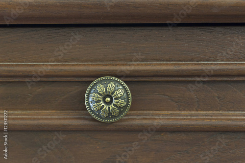 The handle of a wooden cabinet in a circle.