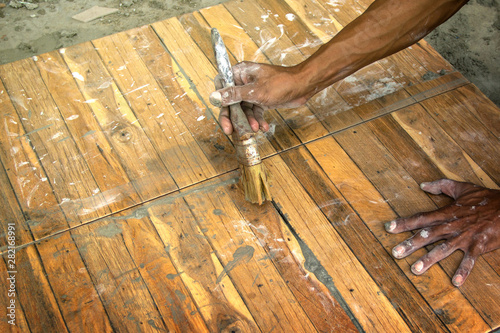 The hands of tiler catch a brush are using to wipe the excess of cement in tiles ceramic groove in tiling work outdoor around the house.