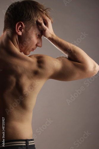 the handsome young man with a naked back holds a hand the head