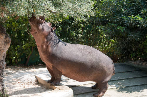 The hippopotamus eats the leaves of the olive tree in a zoo. The hippo grazing.