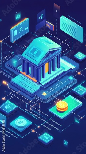 The illustration depicts a vibrant financial ecosystem centered around digital banking and transactions with various currency symbols