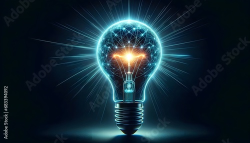 The image displays a light bulb with a glowing wireframe structure and a bright filament at the center that radiates light in all directions, set against a dark background.