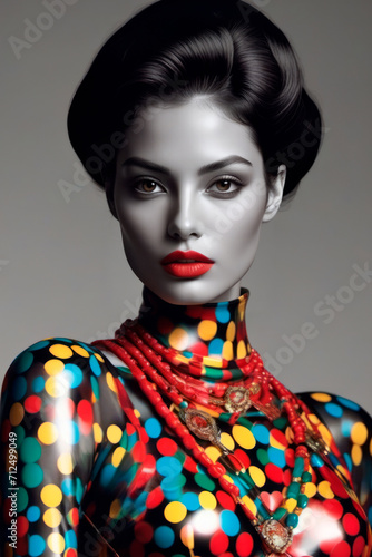 The image features a close-up of a model wearing a colorful polka dot top and red beads. The model has bright red lipstick and her hair is styled in a bun. The background is plain and gray.